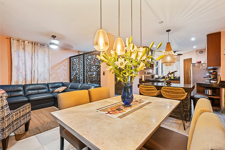 En la planta baja, un diseño de concepto abierto integra una cocina completamente equipada con acabados en mármol, amplios espacios de sala y comedor, y detalles artísticos que elevan el carácter del hogar. El segundo nivel está dedicado al descanso, donde la recámara principal cuenta con walk-in closet, baño tipo spa con jacuzzi y acceso a un exclusivo solárium con alberca de inmersión climatizada, minibar y vegetación que envuelve el espacio en una atmósfera de serenidad.