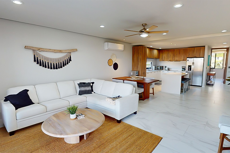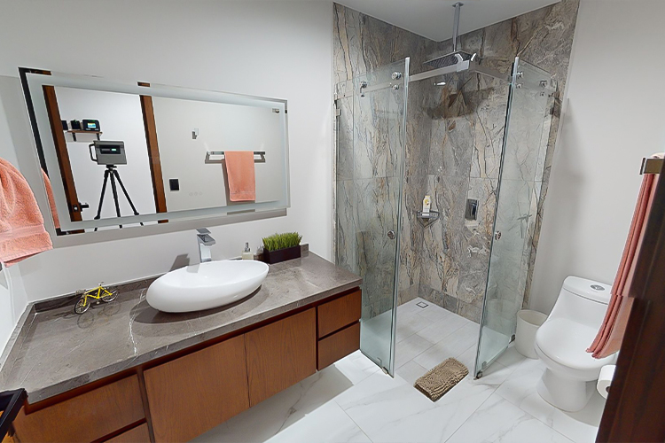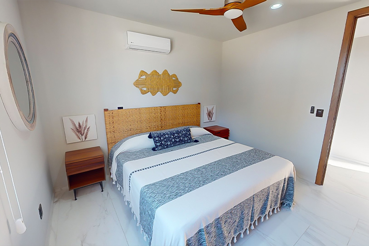 El interior está finamente decorado con materiales de alta calidad como madera de parota, puertas corredizas premium y acabados de lujo. La recámara principal ofrece un ambiente sofisticado con cama King size, mobiliario empotrado y un baño privado con ducha de mármol de piso a techo.